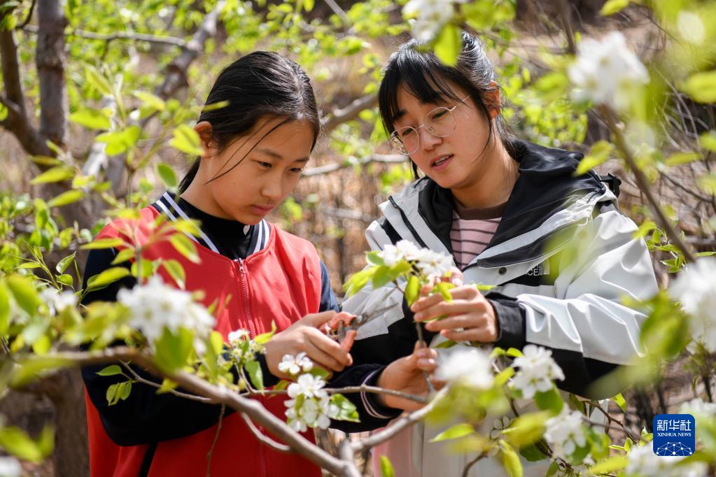 4月21日,承德縣新杖子小學(xué)學(xué)生在老師的指導下學(xué)習為梨樹(shù)梳花。