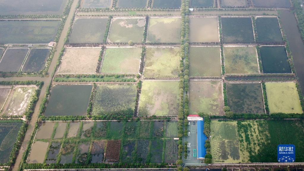 這是4月20日拍攝的大通湖水生植物產(chǎn)業(yè)示范園,園內種植了多種水生植物(無(wú)人機照片)。