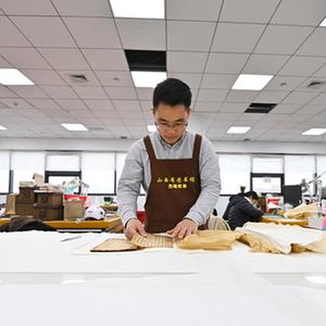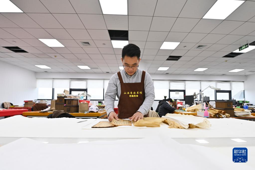 程文濤在山西省圖書(shū)館古籍修復中心內配紙(4月21日攝)。
