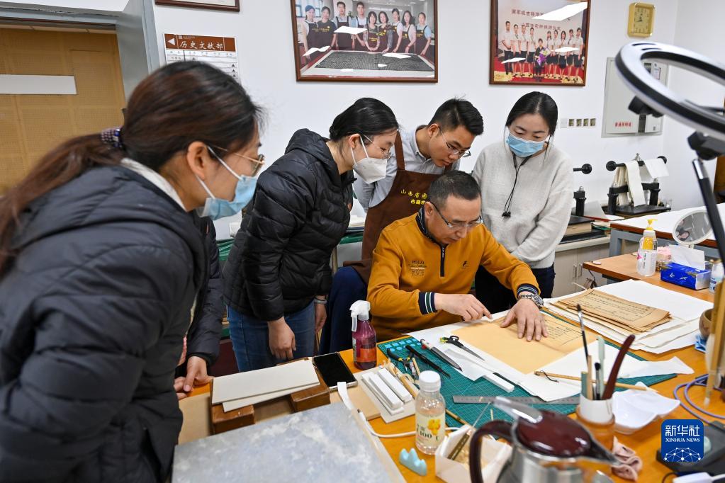 在山西省圖書(shū)館古籍修復中心,修復導師劉建明(右二)向古籍修復師們講解古籍修復細節(4月21日攝)。