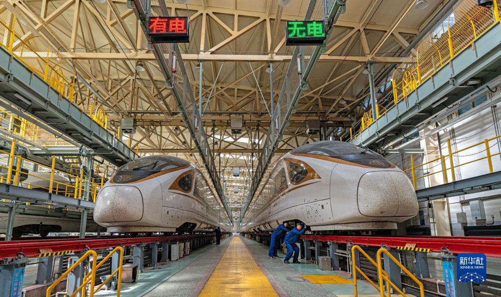 4月22日,在沈陽(yáng)動(dòng)車(chē)段沈陽(yáng)北動(dòng)車(chē)運用所,技術(shù)人員對列車(chē)進(jìn)行檢查維護。