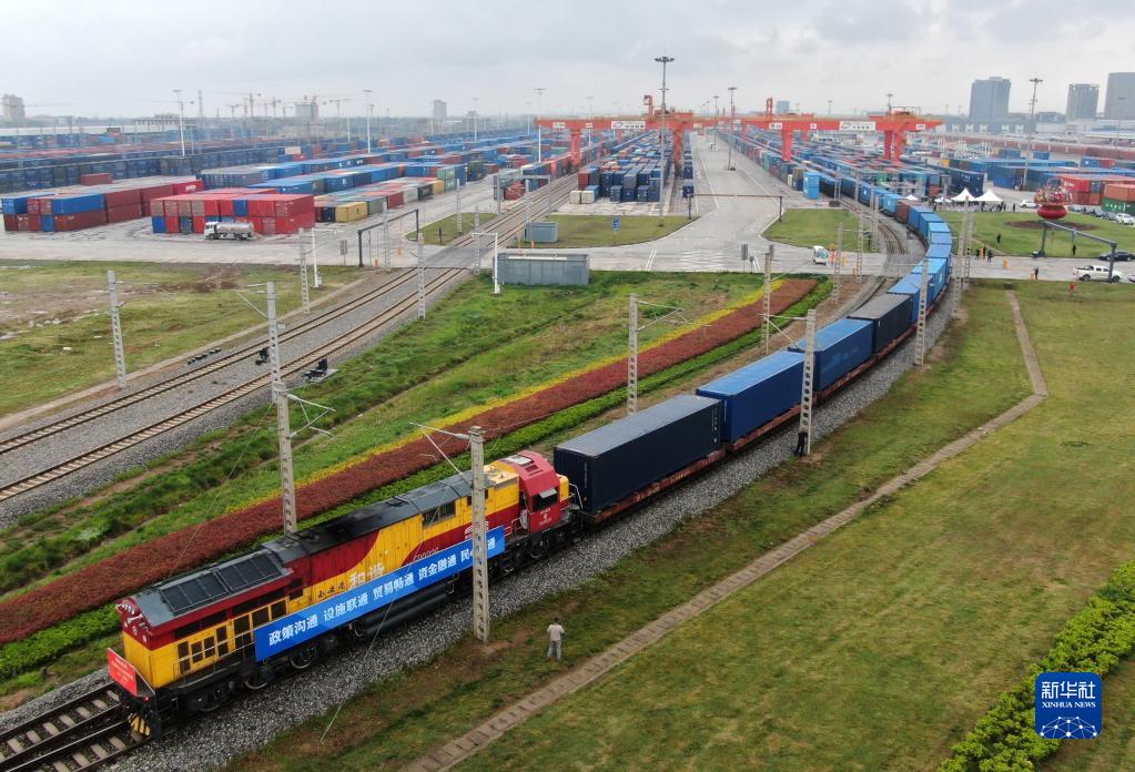 4月23日,中歐班列長(cháng)安號吉利汽車(chē)出口專(zhuān)列從西安國際港站駛出(無(wú)人機照片)。