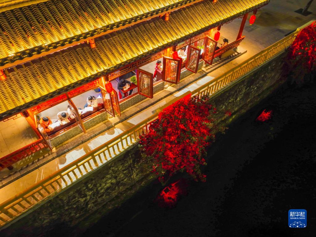 4月20日晚,人們在廣西金秀瑤族自治縣金秀鎮榮興社區24小時(shí)智慧書(shū)屋內讀書(shū)(無(wú)人機照片)。