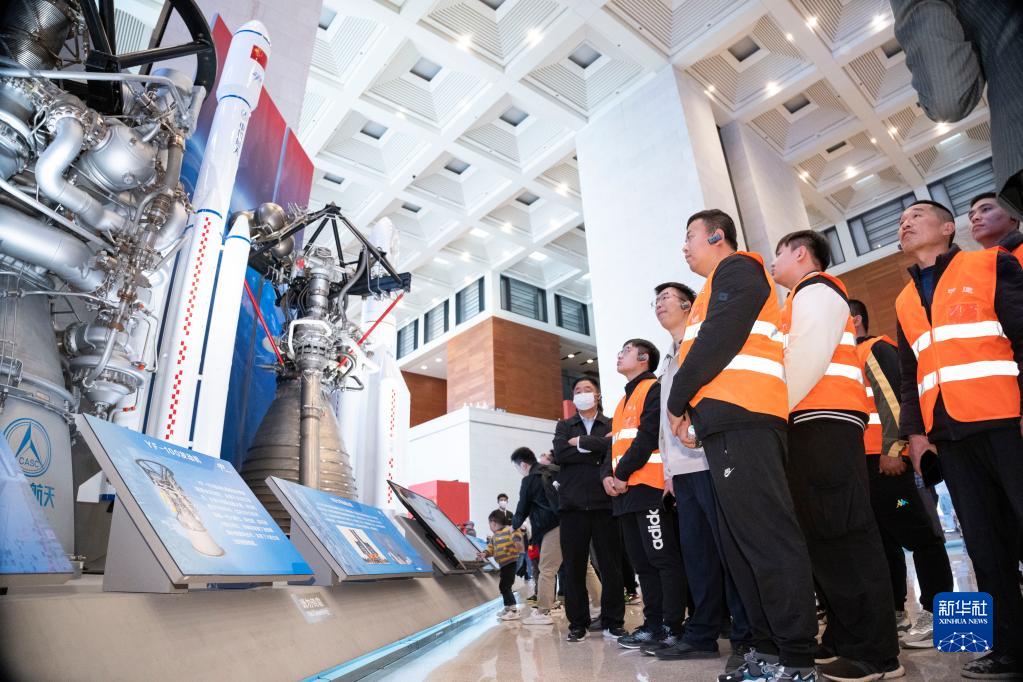 4月23日,中建三局順義航天產(chǎn)業(yè)園項目一線(xiàn)建設者在參觀(guān)“逐夢(mèng)寰宇問(wèn)蒼穹——中國載人航天工程三十年成就展”。
