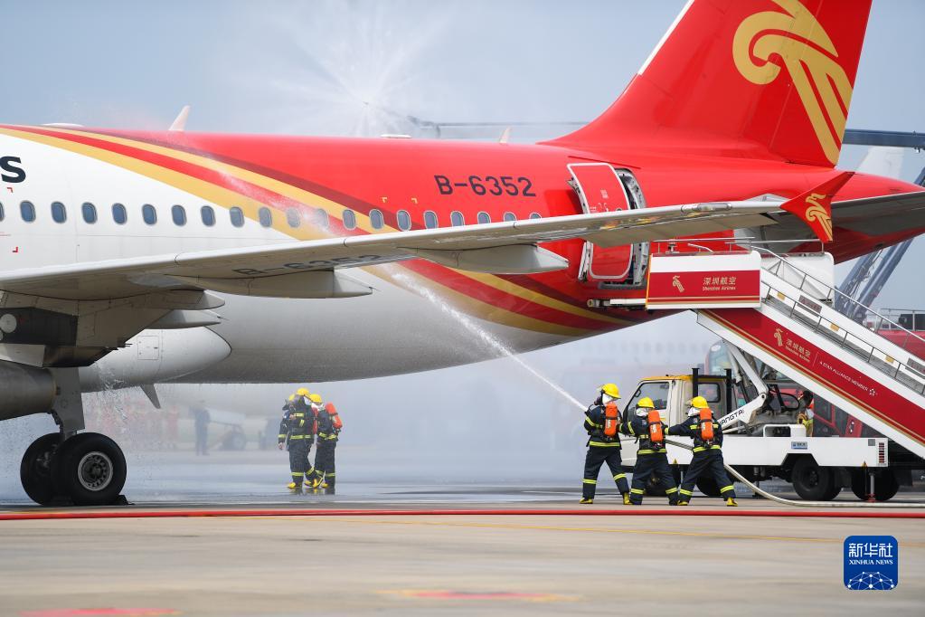 4月23日,在深圳機場(chǎng)舉行的演練中,航空器模擬因機械故障導致右發(fā)動(dòng)機起火,消防員進(jìn)行滅火。