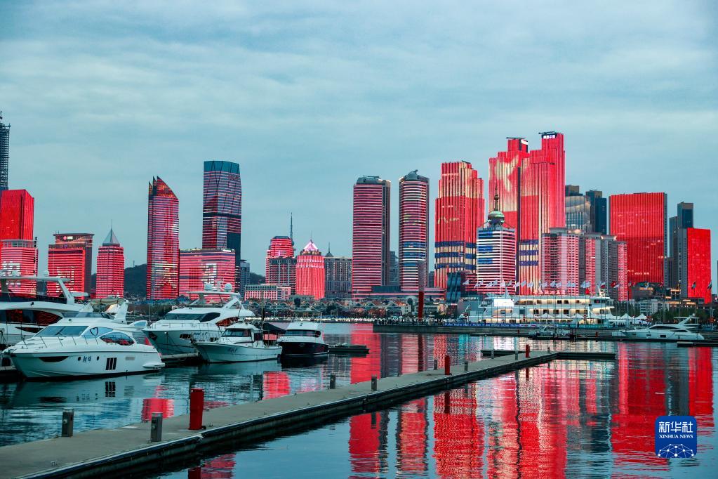 在山東青島浮山灣,大樓樓體亮化構成的巨幅熒屏上演海軍主題燈光秀(4月22日攝)。新華社發(fā)(劉再耀 攝)