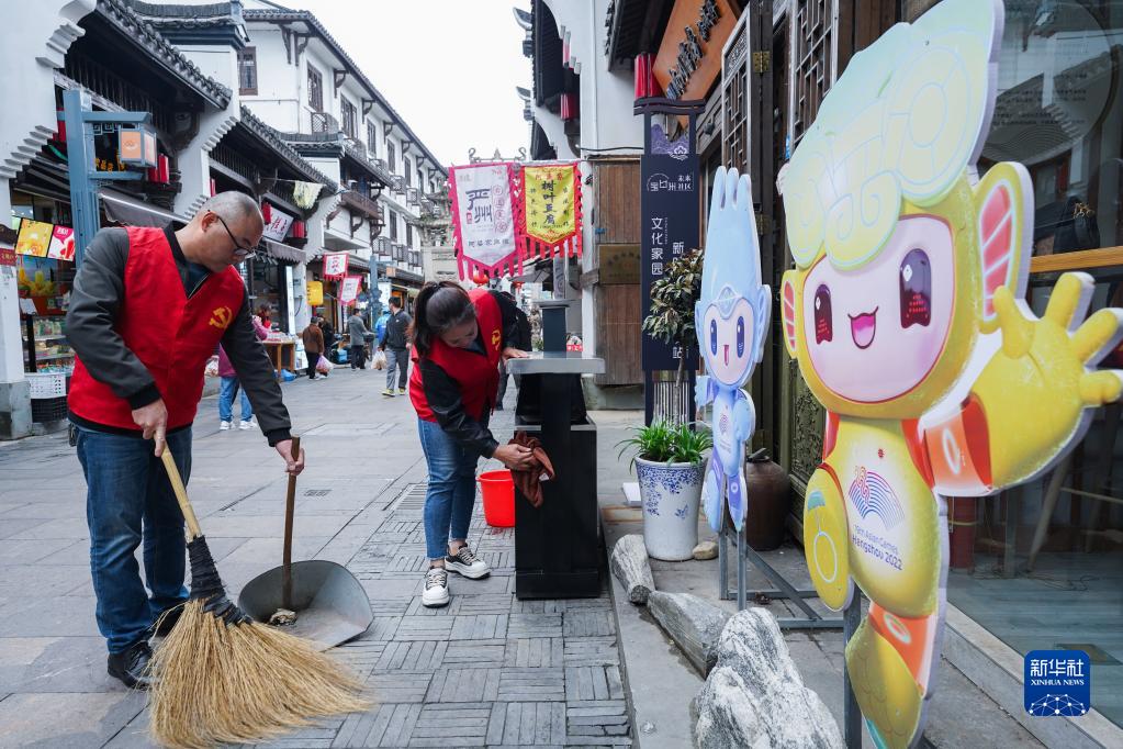 4月24日,在建德市梅城鎮古街,社區黨員干部、志愿者在打掃古鎮衛生。
