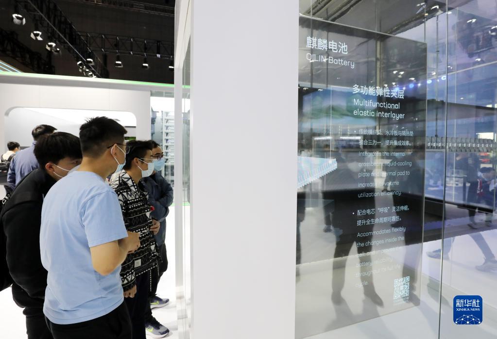 4月24日,參觀(guān)者在寧德時(shí)代麒麟電池展示模型前交流討論。