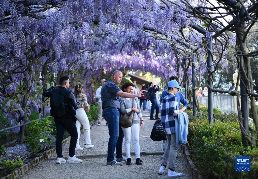 4月24日,在意大利佛羅倫薩,游客欣賞紫藤花。