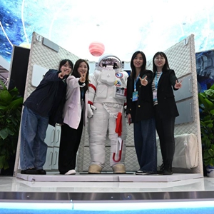 4月24日,觀(guān)眾在科普展區內與航天服模型合影留念。