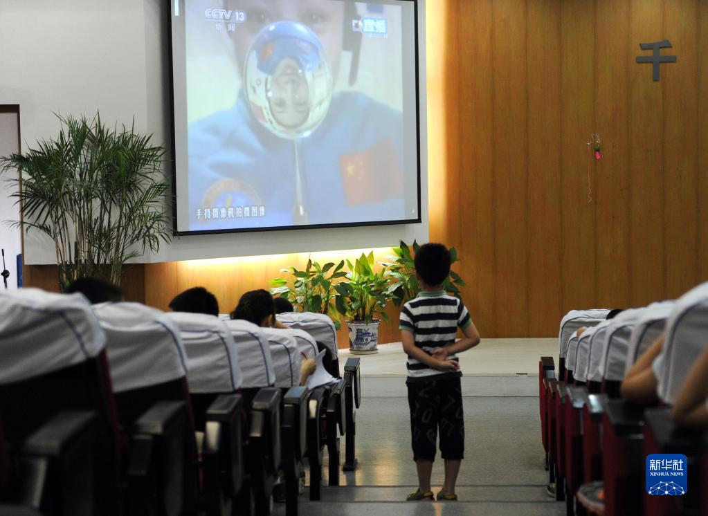 在杭州保俶塔實(shí)驗學(xué)校,小學(xué)生吳潼站在走道上觀(guān)看太空授課(資料圖片,2013年6月20日攝)。當日,航天員王亞平在聶海勝、張曉光協(xié)助下進(jìn)行首次太空授課,全國6000余萬(wàn)名中小學(xué)生觀(guān)看授課直播。