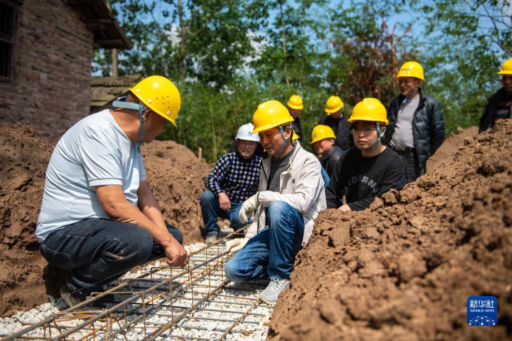 4月25日,在安全鄉恒豐村,技師(左一)向工人們講解扎筋技巧。
