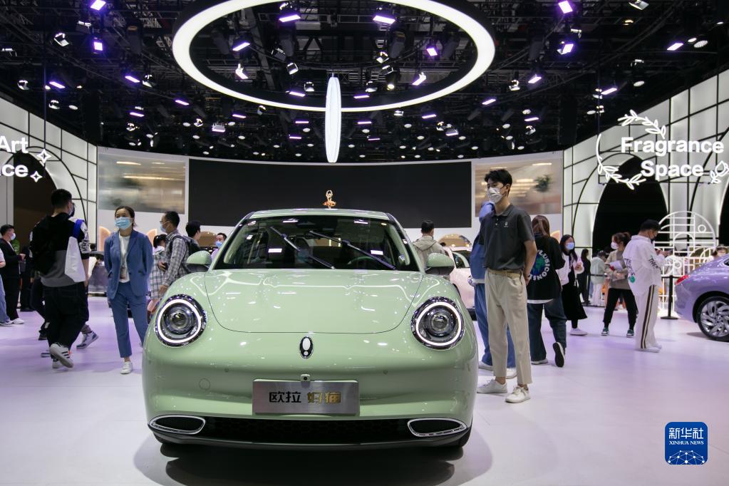 4月25日,參觀(guān)者體驗歐拉好貓展車(chē)。