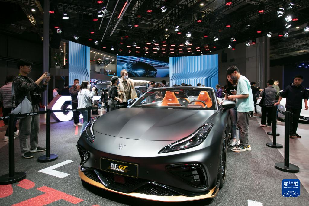 4月25日,參觀(guān)者在哪吒GT展車(chē)邊駐足觀(guān)看。
