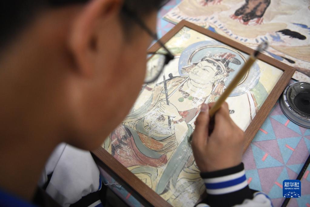 近年來(lái),甘肅省敦煌市敦煌中學(xué)將敦煌壁畫(huà)藝術(shù)引入校園,整合專(zhuān)業(yè)師資力量,通過(guò)美術(shù)課堂、社團活動(dòng)和主題實(shí)踐的方式,加強學(xué)生對敦煌壁畫(huà)藝術(shù)的了解,讓有興趣的學(xué)生在校園里開(kāi)展壁畫(huà)臨摹和藝術(shù)創(chuàng )作,豐富校園文化生活,讓學(xué)生感受敦煌文化的魅力。