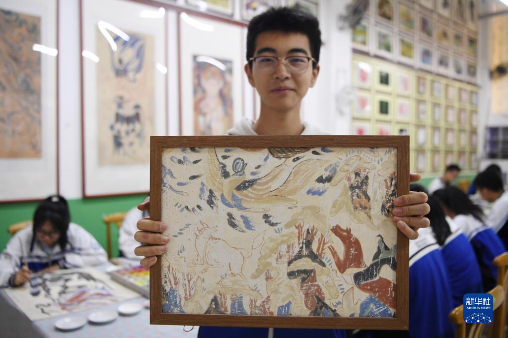 近年來(lái),甘肅省敦煌市敦煌中學(xué)將敦煌壁畫(huà)藝術(shù)引入校園,整合專(zhuān)業(yè)師資力量,通過(guò)美術(shù)課堂、社團活動(dòng)和主題實(shí)踐的方式,加強學(xué)生對敦煌壁畫(huà)藝術(shù)的了解,讓有興趣的學(xué)生在校園里開(kāi)展壁畫(huà)臨摹和藝術(shù)創(chuàng )作,豐富校園文化生活,讓學(xué)生感受敦煌文化的魅力。