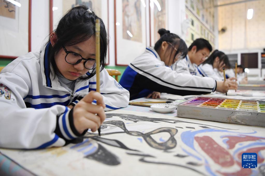 近年來(lái),甘肅省敦煌市敦煌中學(xué)將敦煌壁畫(huà)藝術(shù)引入校園,整合專(zhuān)業(yè)師資力量,通過(guò)美術(shù)課堂、社團活動(dòng)和主題實(shí)踐的方式,加強學(xué)生對敦煌壁畫(huà)藝術(shù)的了解,讓有興趣的學(xué)生在校園里開(kāi)展壁畫(huà)臨摹和藝術(shù)創(chuàng )作,豐富校園文化生活,讓學(xué)生感受敦煌文化的魅力。
