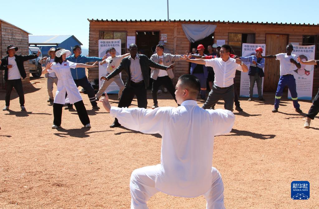 4月25日,在津巴布韋阿卡迪亞礦區,中國第20批援津巴布韋醫療隊隊員帶領(lǐng)中企員工和當地雇員做八段錦。