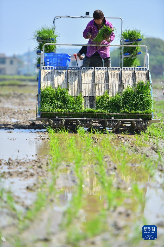 4月26日,在湘潭市雨湖區姜畬鎮易建河村的一處高標準農田,農民駕駛插秧機插秧。