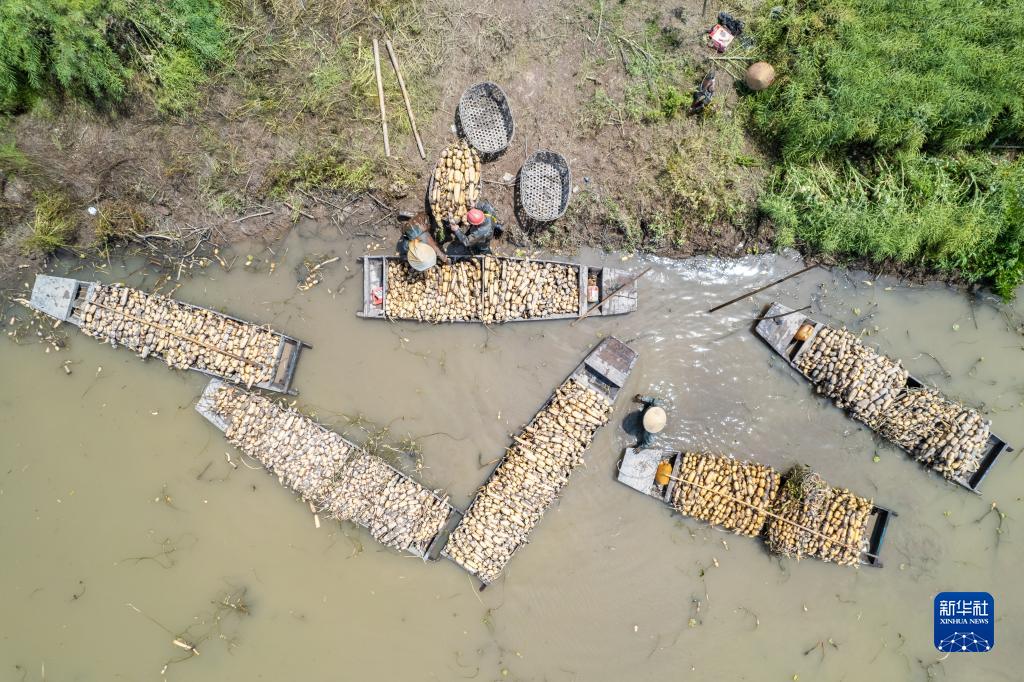 4月26日,在南縣中魚(yú)口鎮菱角湖村,藕農把剛采挖的蓮藕運輸上岸(無(wú)人機照片)。