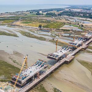 4月25日拍攝的建設中的海南環(huán)島旅游公路東方段感城港大橋(無(wú)人機照片)。