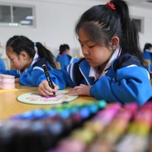 4月26日,在敦煌市西關(guān)小學(xué),美術(shù)社團的學(xué)生在課后服務(wù)時(shí)間進(jìn)行帶有敦煌壁畫(huà)元素的團扇繪畫(huà)。