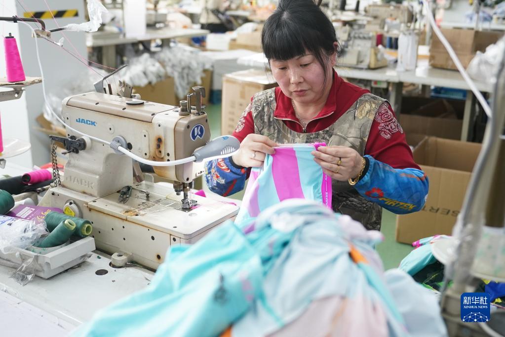 4月12日,在江蘇省句容市瑞波斯特運動(dòng)用品有限公司,工人生產(chǎn)騎行服。該企業(yè)每月生產(chǎn)約1萬(wàn)件自行車(chē)騎行服,供應國內外市場(chǎng)。
