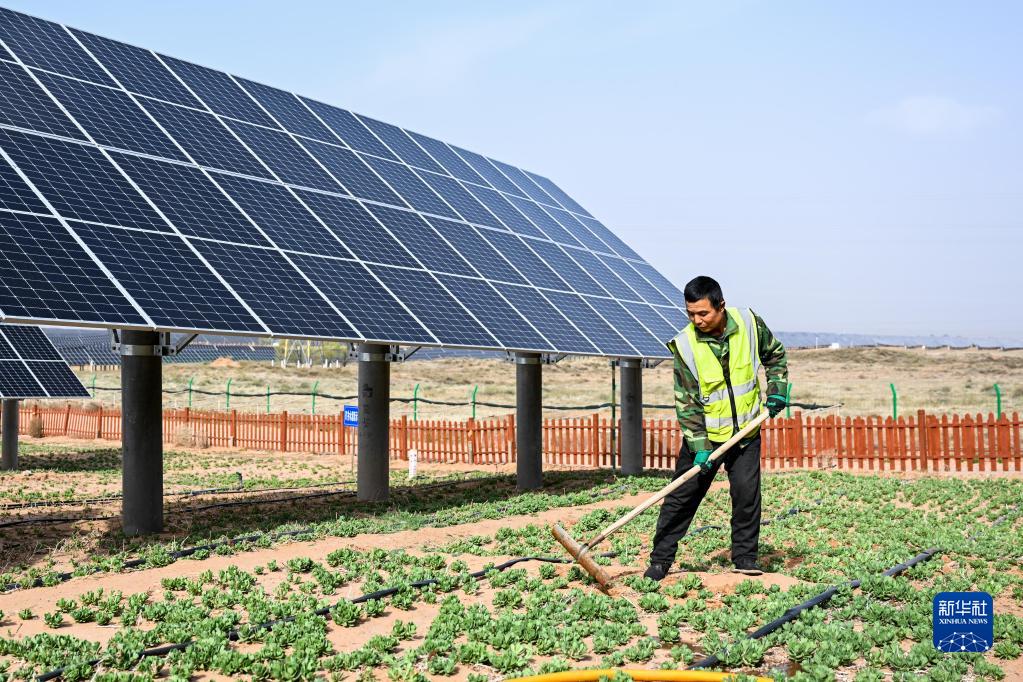 4月26日,工人在天驕綠能50萬(wàn)千瓦光伏項目區內管護牧草。