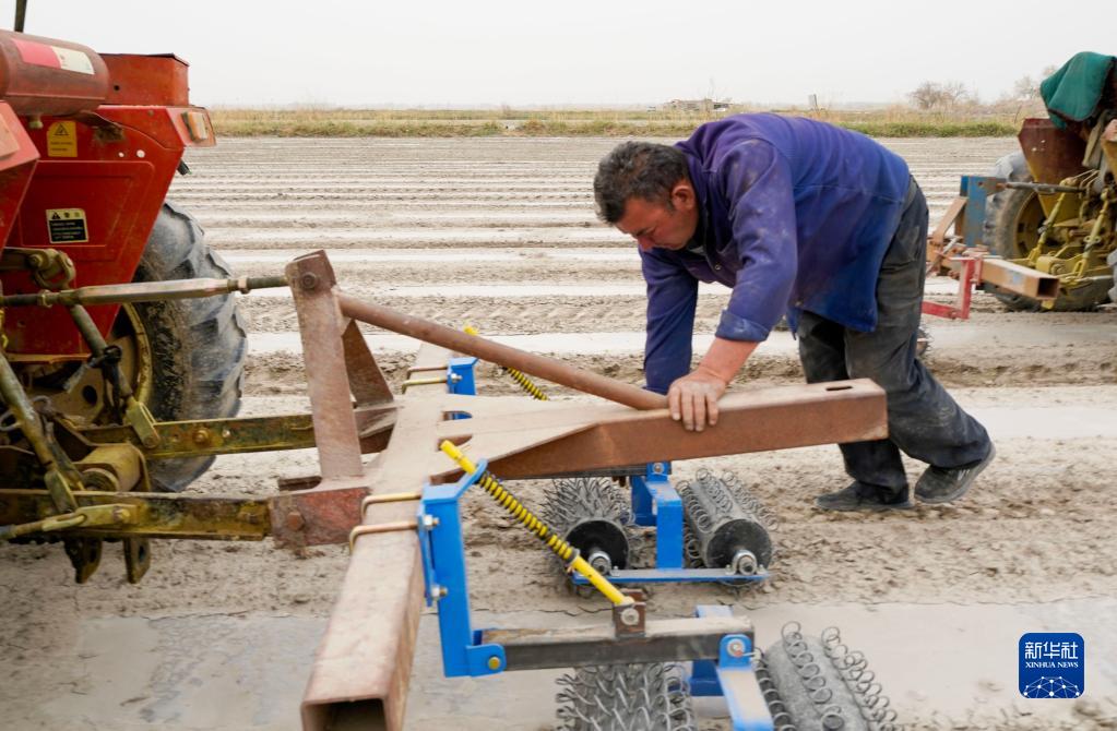 新疆尉犁縣巴西買(mǎi)里村,爾肯·熱衣木俯身壓著(zhù)松土設備前行,以達到更好的松土效果(4月21日攝)。