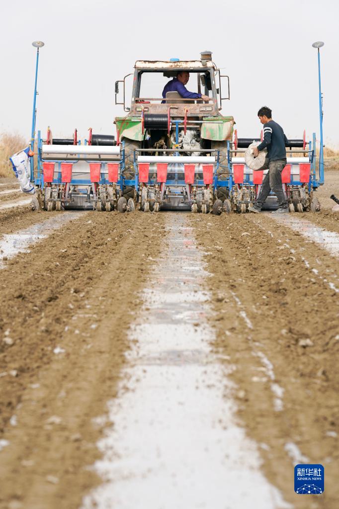 新疆尉犁縣巴西買(mǎi)里村,爾肯·熱衣木駕駛拖拉機在棉田鋪設地膜和播種(4月21日攝)。