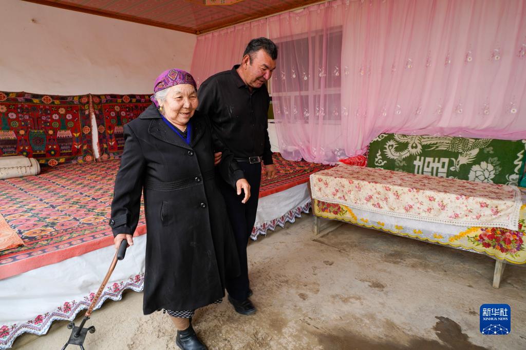 新疆尉犁縣巴西買(mǎi)里村,當日是肉孜節,爾肯·熱衣木攙著(zhù)母親準備去吃飯(4月22日攝)。