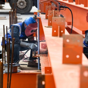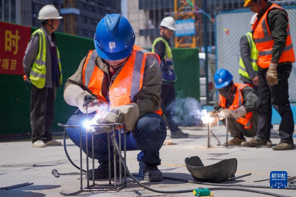 4月27日,在江蘇南京華貿項目施工現場(chǎng),建設者代表在中建三局浙江公司組織的“技能大比武”活動(dòng)中參加鋼筋焊接比賽。