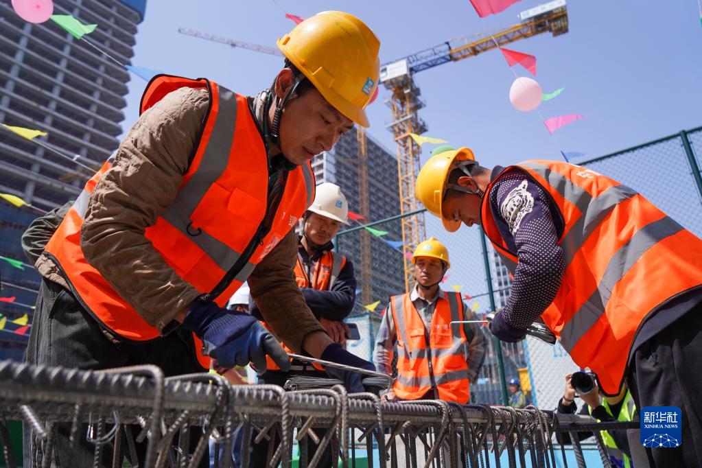 4月27日,在江蘇南京華貿項目施工現場(chǎng),建設者代表在中建三局浙江公司組織的“技能大比武”活動(dòng)中參加鋼筋綁扎比賽。