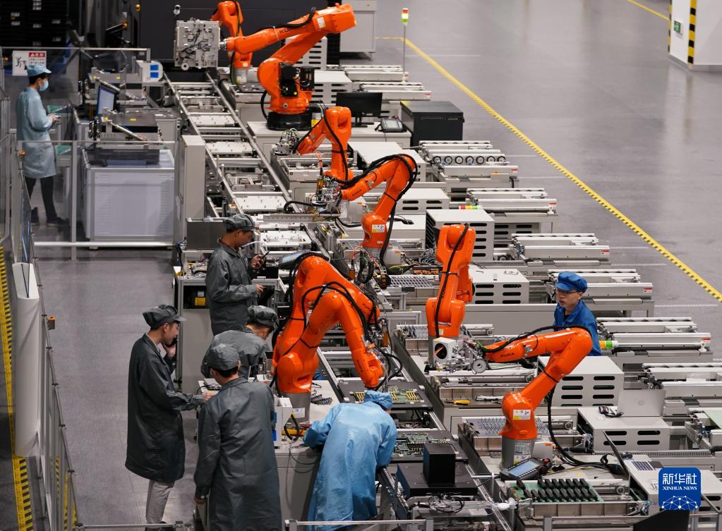 4月27日,在位于浙江杭州市蕭山區的紫光股份信息通信產(chǎn)品未來(lái)工廠(chǎng),技術(shù)人員在調試生產(chǎn)線(xiàn)設備。
