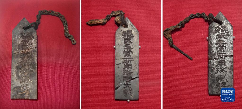 這是曹操高陵遺址博物館內展出的“魏武王常所用挌虎大刀”(左)“魏武王常所用挌虎大戟”(中)“魏武王常所用挌虎短矛”石牌(拼版照片,4月22日攝)。
