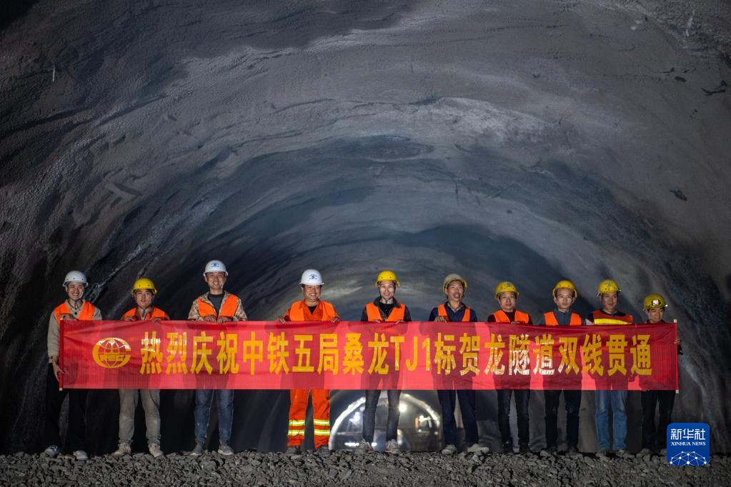 4月27日,在湖南桑龍高速賀龍隧道,工人慶祝隧道貫通。