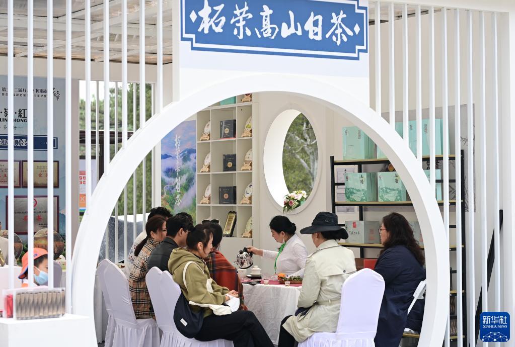 4月28日,人們在北京八大處公園品嘗柘榮高山白茶。