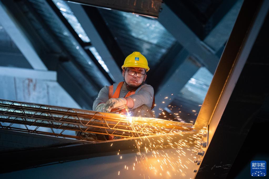 4月28日,在郴州市文體中心建設工地,中建五局裝飾公司工人在進(jìn)行鋼結構桁架樓層板安裝作業(yè)。