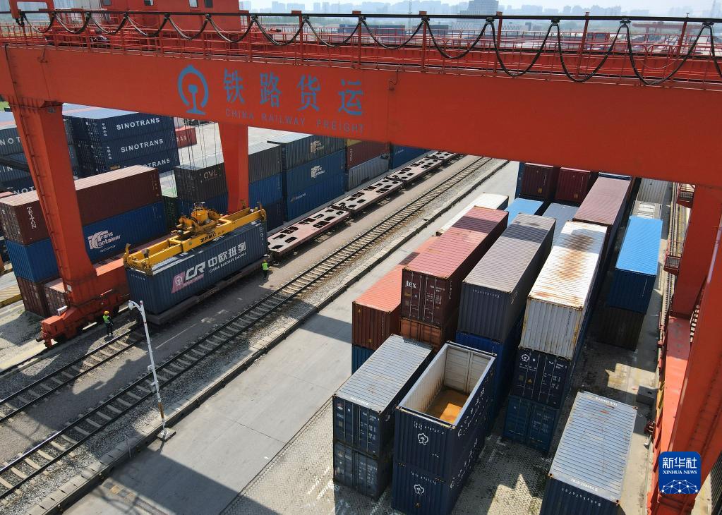 在鐵路合肥貨運中心合肥北站物流基地,吊車(chē)司機將中歐班列集裝箱吊運到列車(chē)上(4月27日,無(wú)人機照片)。