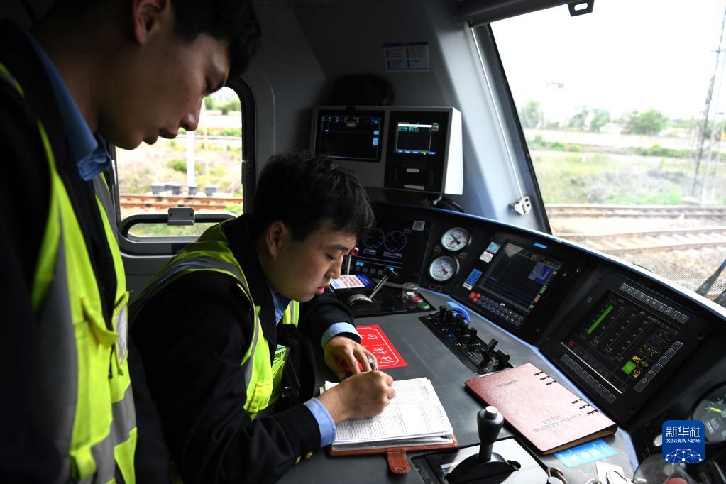 4月28日,尚志雄(右)和副司機田錦波在值乘的中歐班列機車(chē)上做信息登記。新華社記者 金劍 攝
