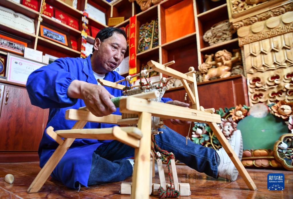 拉巴次仁在拼裝紡織機木雕工藝品(4月25日攝)。