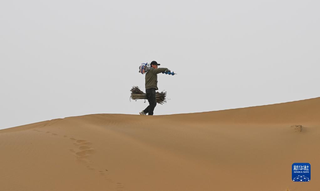 在內蒙古庫布其沙漠億利生態(tài)治理區,治沙客周斌祿前往下一片種植區域(4月27日攝)。