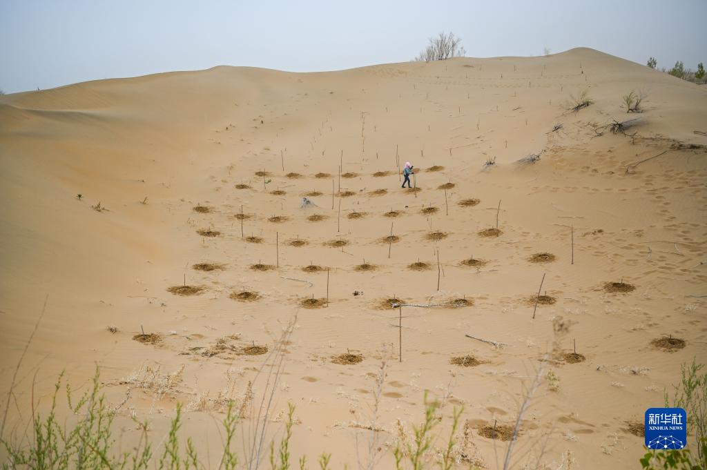 治沙客在內蒙古庫布其沙漠億利生態(tài)治理區種植苗木(4月27日攝)。