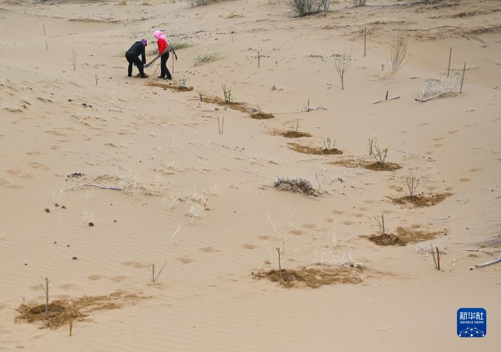 治沙客在內蒙古庫布其沙漠億利生態(tài)治理區種植苗木(4月27日攝)。