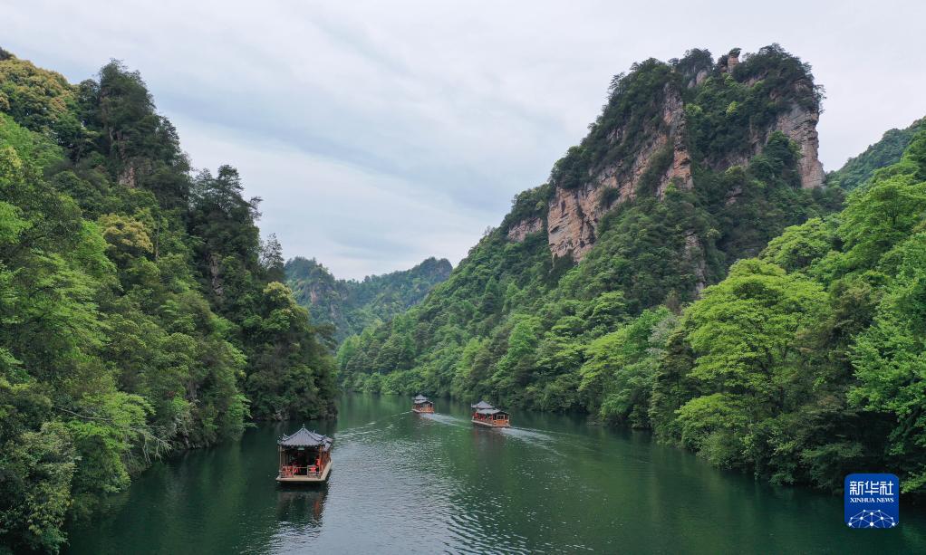 4月29日,游客在湖南張家界寶峰湖景區乘船游覽(無(wú)人機照片)。