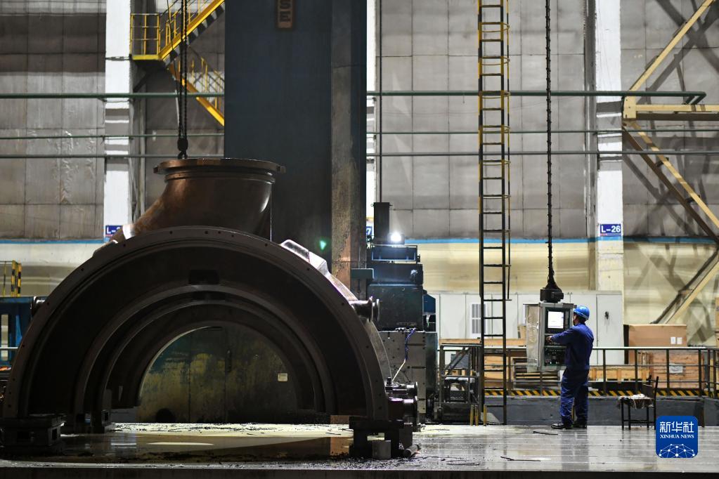 4月10日,工作人員在哈電集團哈爾濱汽輪機廠(chǎng)有限責任公司車(chē)間內操控大型數控設備。