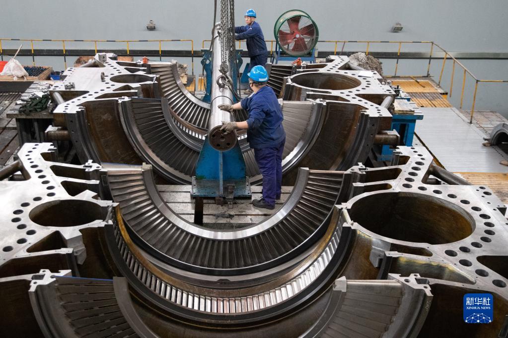 4月28日,工作人員在哈電集團哈爾濱汽輪機廠(chǎng)有限責任公司車(chē)間內進(jìn)行設備組裝。