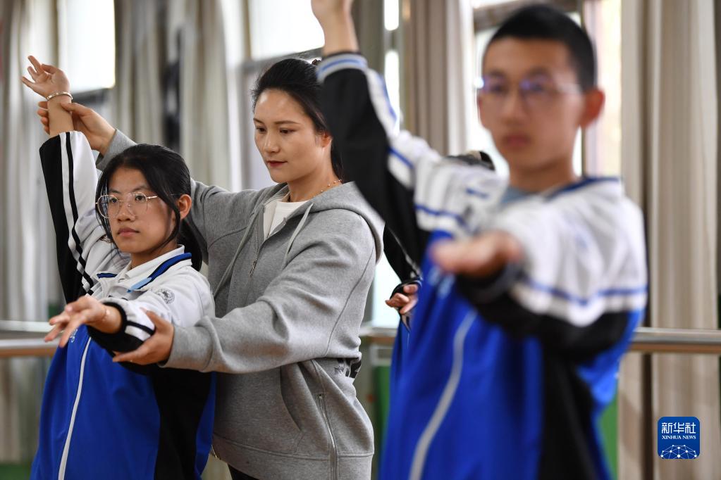 敦煌中學(xué)教師張夢(mèng)婷(中)在舞蹈教室給學(xué)生糾正敦煌舞課間操的動(dòng)作(4月26日攝)。