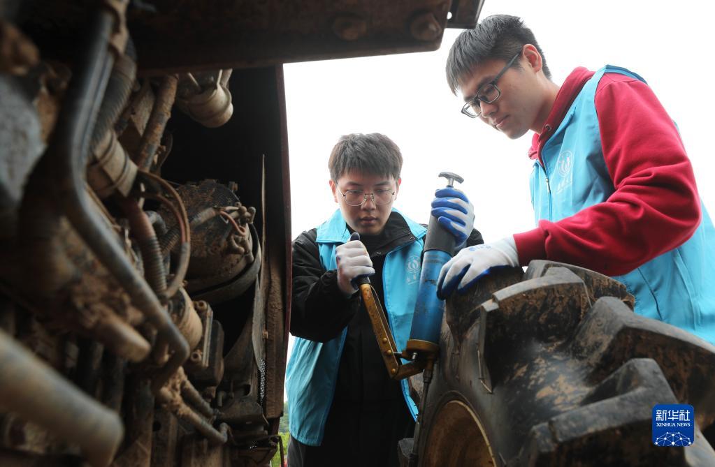 4月29日,在衡陽(yáng)縣西渡鎮新橋村,南華大學(xué)的大學(xué)生志愿者在保養農機。