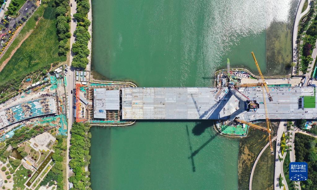 4月29日,石家莊市學(xué)府路東延跨太平河橋主橋實(shí)現合龍(無(wú)人機照片)。